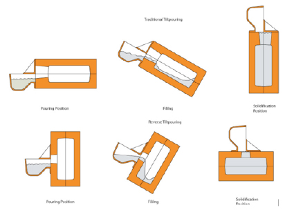 - Filling the mold cavity by tilting, allows the liquid metal to flow down the side of the mold with little or no turbulence, filling the mold with little to no oxides