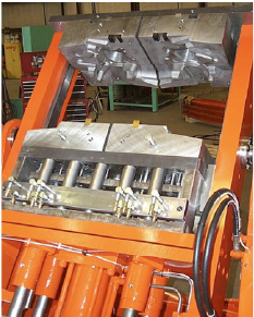 The tilt pour process is one variation of the permanent mold process. Simply put, the tiltpour casting process is the pouring of molten aluminum into a mold by tilting the mold to fill it in a controlled fashion. In traditional tiltpouring the mold parting line is perpendicular to the floor during the solidification phase, while in reverse tilting the parting line is parallel to the floor. Turning the parting line allows the casting to be center fed similar to the way a casting produced in the low pressure process is fed. This feature makes reverse tilting a cost effective alternative to capital-intensive low-pressure casting. In many cases the casting can be direct poured, eliminating costly runner bars and increasing yield.