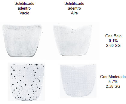 CASERO → PRODUCTOS → Foundry Accessoriesón → Vac-U-Compruede Vac-U-CompruedeHidrógeno es nuestro amigo o enemigo ? Dependiendo en el tipo de fundicion que produzcamos, la absorción del hidrogeno por medio del aluminio fundido puede ser provechoso o dañino. Con la VAC-U-CHECK de HALL usted esta asegurado rápido, económicamente y en un método actualizado de monitorear el nivel de hidrógeno en su fundición. La aspiradora solidifica la muestra exagerando el tamaño del hoyo, haciendo el análisis del gas en la muestra fácil para determinar por medio de los métodos visuales o usando la fórmula específica de gravedad. El uso de la unidad VAC-U-CHECK es simple. Mojar ¼ lb. del aluminio derretido de su horno. Ponga la muestra en la cámara de la aspiradora para solidificarse. Después que la muestra se haya enfriado, córtela a la mitad para una inspección visual o pesar la muestra en el aire y agua para determinar la gravedad específica. Deben sus fundiciones estar en un nivel de máxima calidad, una mínima cantidad de gas es requerido. Si estas produciendo comercialmente una pequeña cantidad de gas podría ser dañino para reducir el encogimiento, esto simplifica los métodos y calidad de producción, acá y dejando mas ganancias. Vea las muestras arriba y observe el encogimiento la diferencia en la muestra solidificada en el aire.