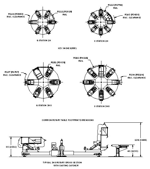 CASERO → PRODUCTOS → Máquinas Rotatorias Del Estilo → Estilo Rotatorio Estilo RotatorioVertir Por Inclinacion El HALL Rotary Casting Machine avanza permanentemente con un modelo de fundicion de tecnología otro paso y lo hace el mas aproximado para las modernas fundidoras hoy en dia. Este sistema producción completamente automatizado se aplica a sus necesidades para un gran volumen de aplicaciones. Nosotros incorporamos hasta 12 maquinas fundidoras estándar (maquinas #2H, #3HS, #6H, or RT) en una mesa rotatoria que reduce el ciclo del tiempo en cada estación de hasta 20 segundos. Como un ejemplo, basado en nuestra 8-station HALL #2H Rotary Table, nosotros hemos calculado que ocho segundos son necesarios para indexar la mesa entre las estaciones sin que las fuerzas afecten las características de la fundidora. Asumiendo a 3 minutos (180 segundos) de ciclo de enfriamiento, este sistema rotario teóricamente producirá 120 ciclos por hora. Teóricamente al 83%, serian 100 ciclos de maquina por hora. A 100 horas por semana, esto calcula 10,000 ciclos de maquina por semana. Si hay 2 huecos, producirá 20,000 partes por semana. Si tuviésemos un 3 y ½ minutos de ciclos de enfriamiento, y después multiplicarlo por .86. Esto nos daría un total de producción de mas o menos un millón de partes por año. Caracteristicas Click to enlarge. The drawing (above) requires Adobe Acrobat Reader to view.